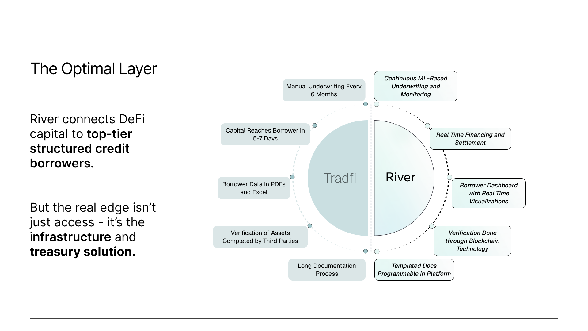River is the infrastructure that brings stable, scalable, and composable decentralized capital to neobanks, fintechs, and F500 institutions. **River creates a seamless financing experience by providing distribution, underwriting, risk management to DeFI and operational excellence, flexibility, ongoing management, and cost savings to Borrowers.**